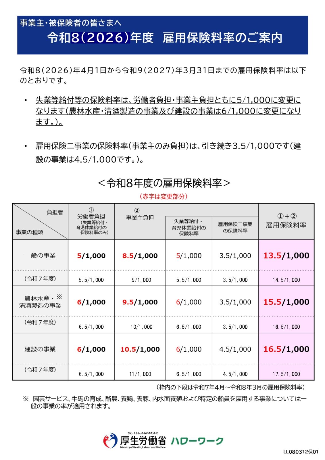 令和8年度(令和8年4月1日〜令和9年3月31日)の雇用保険料率が変更となります。